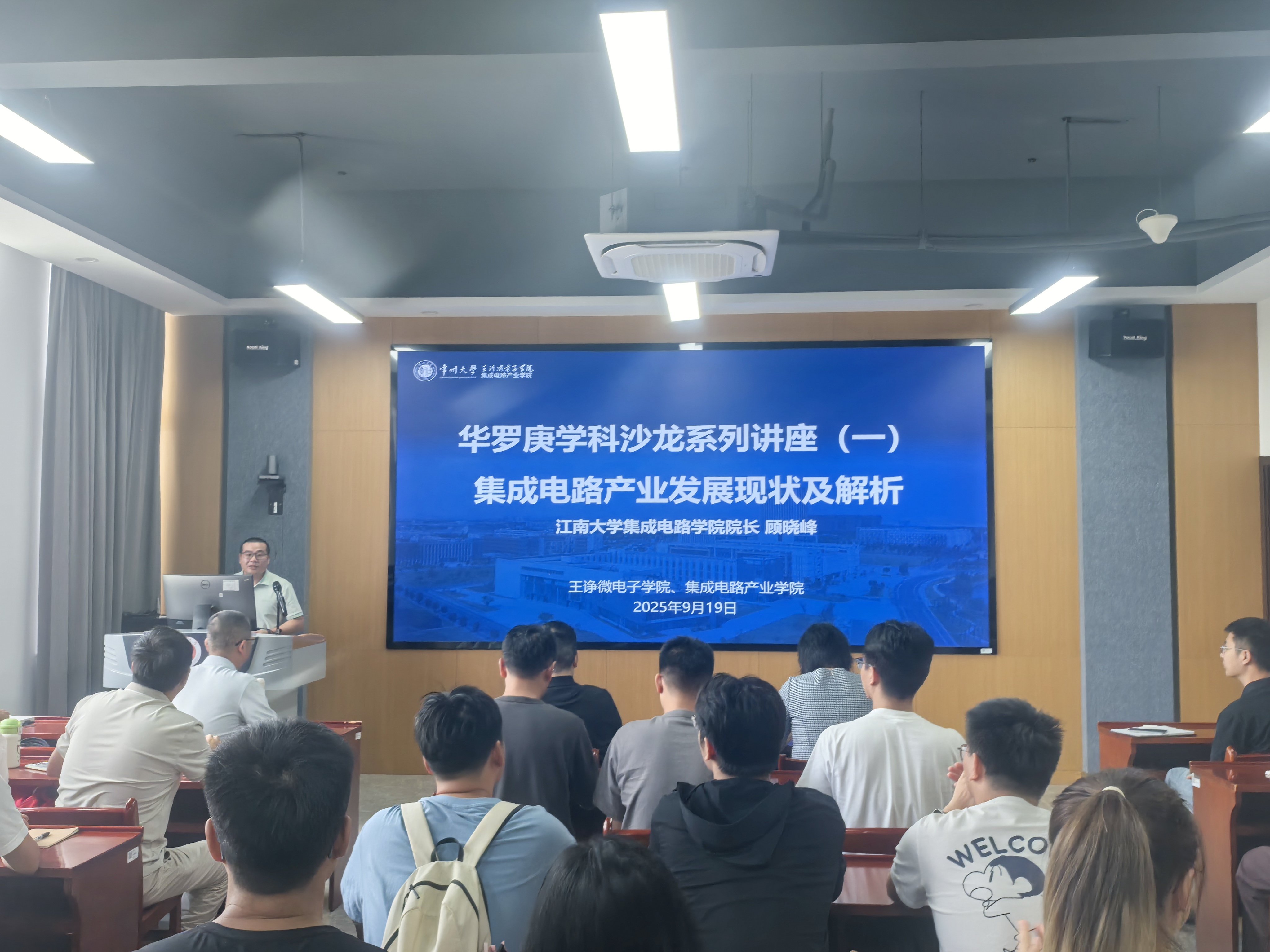 9月19日上午,王诤微电子学院、集成电路产业学院在立功楼402举办华罗庚学术沙龙系列讲座第一讲,江南大学集成电路学院院长顾晓峰教授应邀为我院师生作题为《集成电路产业发展现状及解析》的主题讲座。集成电路设计与集成系统和电子科学与技术专业师生到场聆听,学院副院长徐权主持会议。